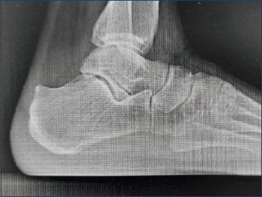 Una radiografia sotto carico del piede è l’esame di primo livello, che permette di evidenziare la presenza di una prominenza postero superiore del calcagno, e di eventuali ossificazioni inserzionali intra tendinee. Questa permette anche le misurazioni necessarie (Fig. 3).