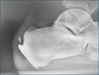 Figura 2. Radiografia che mostra una deformità di Haglund associata ad entesopatia calcifica dell’Achille.