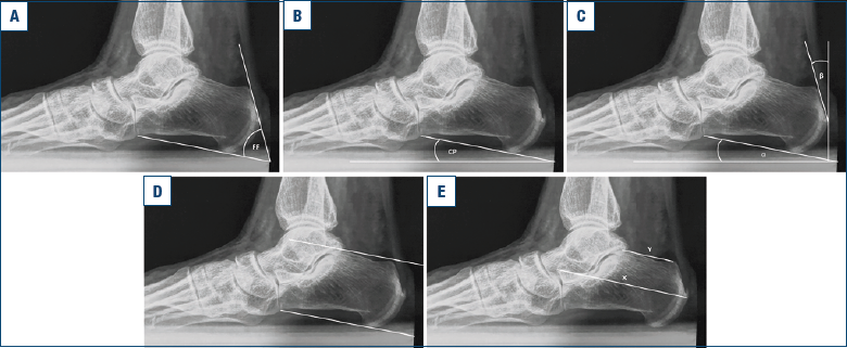 Figura 3. Misurazioni radiografiche della deformità di Haglund: (a) angolo di Fowler-Philip; (b) calcaneal pitch; (c) angolo di Chauveaux; (d) linee parallele di Heneghan-Pavlov; (e) X/Y ratio.