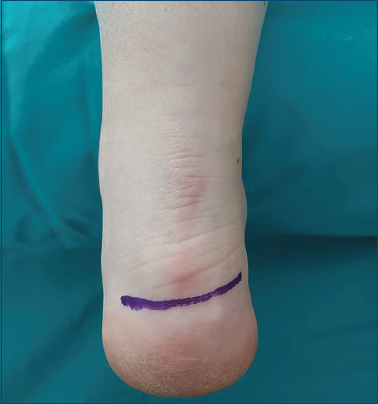 Si tratta di un accesso trasversale lungo le pieghe cutanee retrocalcaneari a livello della deformità del calcagno (Fig. 4). I chirurghi che preferiscono questo tipo di accesso sostengono che la cicatrice matura è quasi invisibile e molto accettabile. Sostengono anche che il nervo surale a tale livello è già distante dal tendine e diviso in numerosi rami, e che pertanto non si osservano casi di lesione o intrappolamento del nervo 43,44.