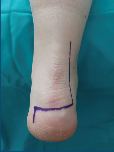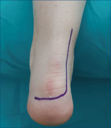 L’incisione prossimale è parachillea mediale. La parte trasversale dell’incisione viene eseguita a livello della deformità, lungo una delle pieghe cutanee, come nel caso della Cincinnati. La parte distale è di nuovo longitudinale laterale a livello del calcagno. È importante che gli angoli siano assolutamente retti (Fig. 6) 10.