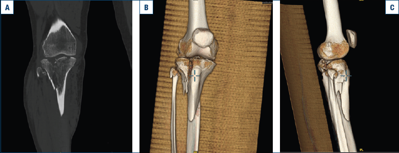 Figura 1. (a, b, c) TC e ricostruzione 3D tramite Tc della frattura del piatto tibiale.