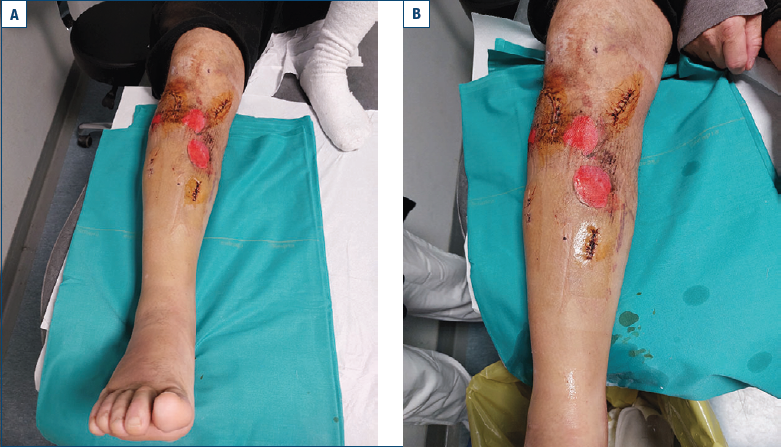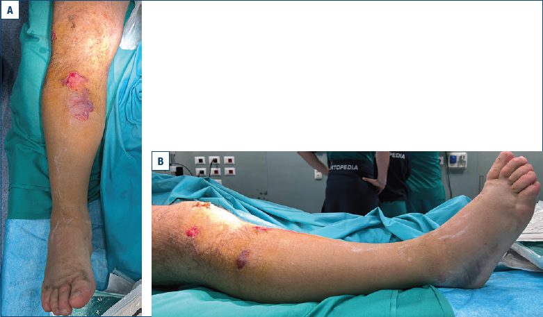 Il trauma ha anche determinato una lesione cutanea associata a livello anteriore-prossimale della gamba, compatibile con trauma contusivo-lacerocontusivo diretto (Fig. 2 a, b).