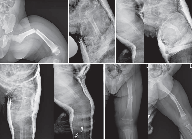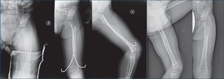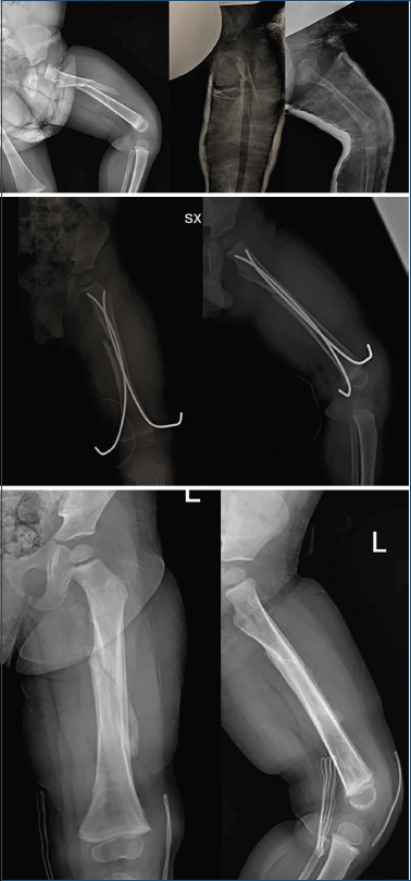 Figura 5. Paziente di 4 anni con gesso pelvi podalico, successivo controllo radiografico ritenuto “non accettabile” e successivo shift con chiodi elastici con cui si è ottenuta la consolidazione.