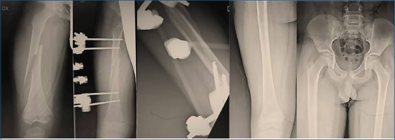 Figura 7. Paziente di anni 8, trauma in motociclo elettrico, concomitava trauma contusivo splenico, trattato in urgenza con fissatore esterno, consolidazione a 90 giorni con follow-up radiologico a 3 anni.